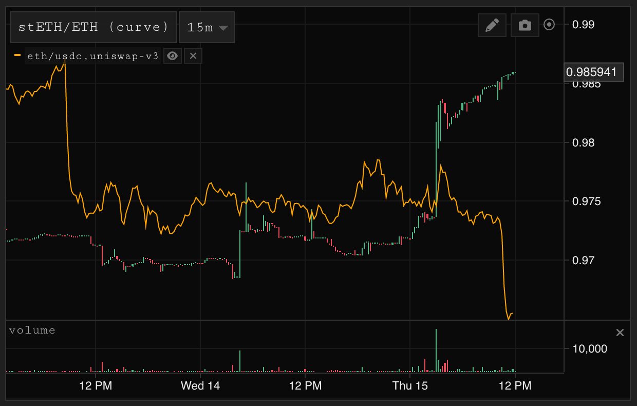 stETH was crutched into the merge since it carried both the execution risk of the upgrade but also an embedded discount relating to the ETH pow fork value. A switch has clearly been flipped for this asset moving forward (it is yield bearing after all) and no longer tracks ETH beta. The pressure release on this asset avoids a potentially calamitous leverage unwind on aave.