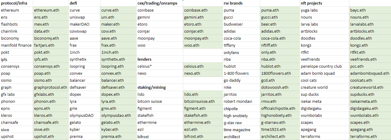 Do you think we will see major adoption of .eth domains in the next 20 years? google.eth, apple.eth, amazon.eth being used as infrastructure? Currently not a whole lot of web2 giants own their domain though Nike, Budweiser, and Coca-cola all do. On the other hand a huge amount of crypto infrastructure, data platforms, funds, NFT marketplaces and projects all own theirs. Here is a comprehensive list compiled by @etheraltog.
