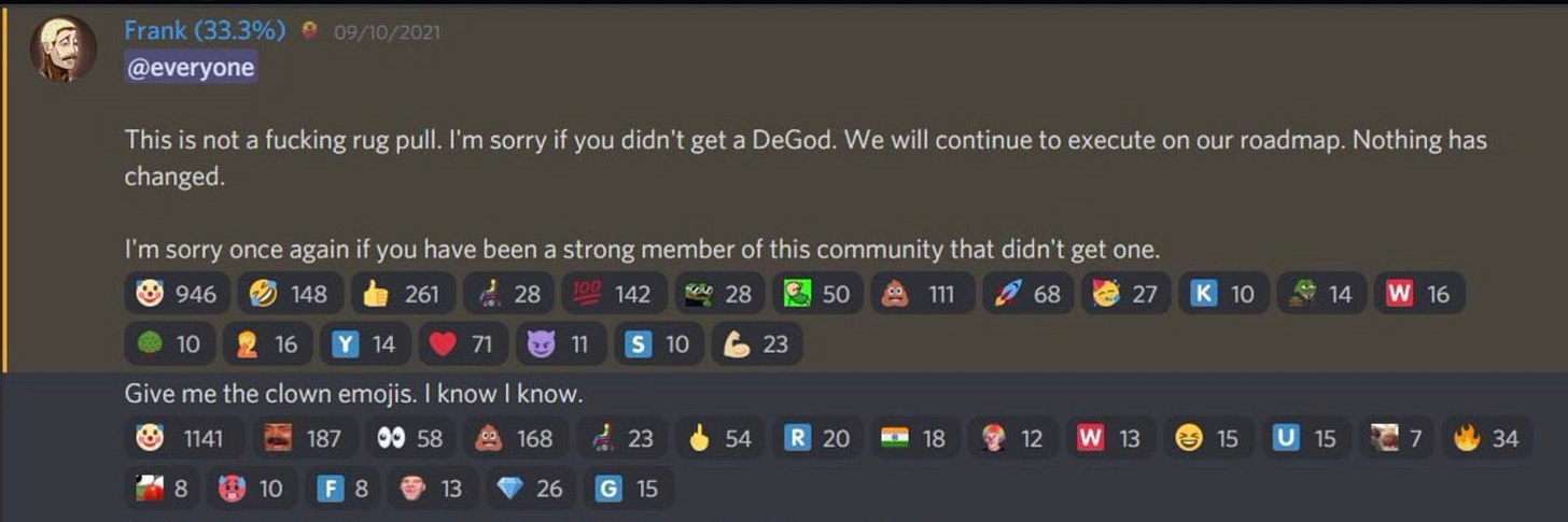 Frank has spoken DeGods into existence and success. Despite being undoxxed he is an incredibly public figure. Always attending interviews, podcasts, twitter spaces, parties, NFT centric irl events and the list goes on. It’s been a masterclass in marketing for anybody watching. He is constantly putting himself and DeGods into the limelight, and whether it’s good or bad attention it’s worked wonders for their fame and notoriety - I admire his work ethic and ability to put himself out there. To get an idea of what I mean, I’d suggest watching the quick promo video on the DeGods website. Featuring Gary Vee and IceCube it should give you a bit of an idea of what I’m talking about and their rise to stardom over the last year.