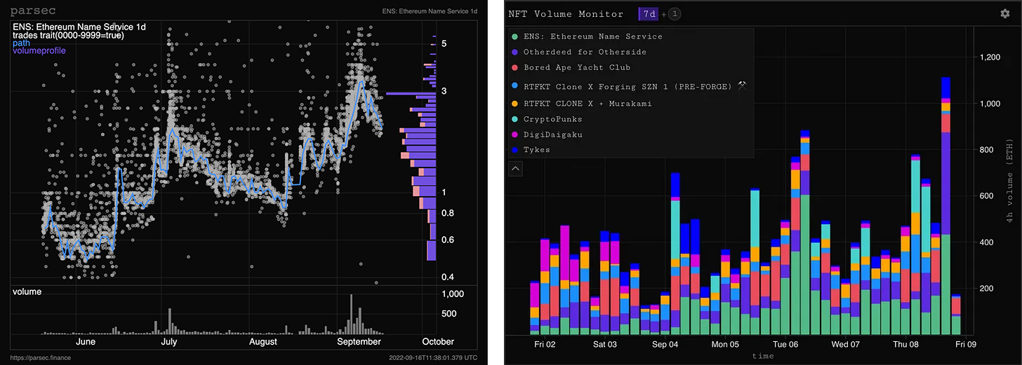 I can’t say exactly why it’s been pumping so hard. ENS is one of those collections I don’t see much chatter about on the timeline, which I suppose means you could instead attribute the volume to organic growth and demand instead of ‘pump it’ mechanics. The value proposition of buying ENS now can be likened to buying up .com’s in the early 2000’s, but why are people buying up numbers? The answer is provenance, owning 420.eth or 069.eth is a flex, it says you were here and you took part in early crypto culture. Similar to the off shoots that arise when a pfp collection becomes popular, digit derivatives have started being popularised - addresses with all sorts of prefixes and suffixes, 999 clubs in other languages, 0x this, $ that. Ens.vision is probably the best site for exploring the world of Ethereum addresses, you can also register names through them.