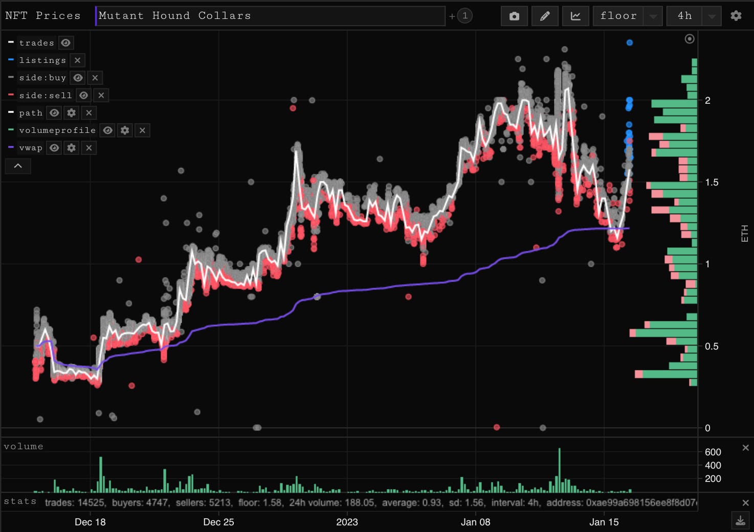 On Wednesday, holders were eligible to burn a collar to receive a hound. Despite their strength, they didn’t manage to escape the infamous post-reveal dump. Immediately post burn, some large sweeps took price to a high of Ξ2.1 before swiftly retracing to the Ξ1.4 region. Yet they still haven’t broken HTF support and just bounced off the 4h vwap. I wouldn’t be surprised to see them continue trending up over the next 6 weeks while the rest of the Yuga story plays out. The support they’ve received and backing from OG Yuga holders has all but cemented them within the ecosystem.