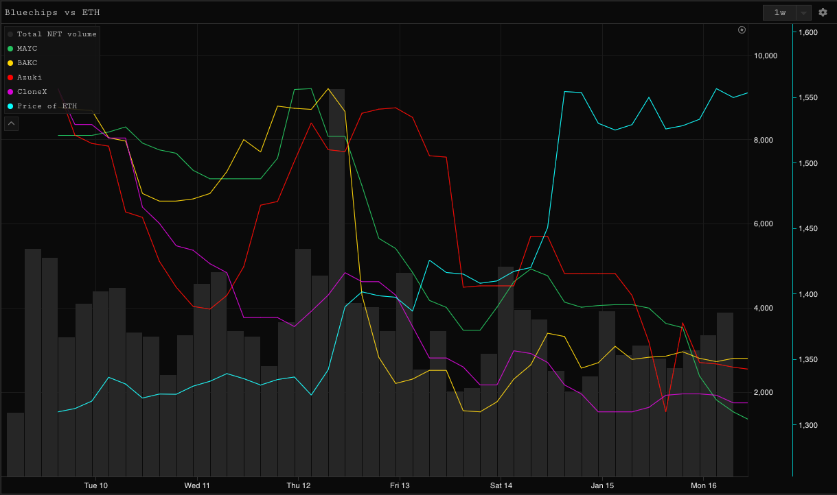 The week started off strong as the NFT market rallied, bluechips pushed higher and the direction took a weird turn as profits flowed into every half baked degen mint. Most half-decent looking jpegs lined with the current narrative will mint out and get a wee pump, but for the last few months that’s all they’ve been getting before late entrants are left holding the bag. The degen flavour of the week is feetpix.wtf, yes that’s right - 10k pictures of pixellated feet are currently up more than 7000%, running from a low of Ξ0.001 to Ξ0.14.