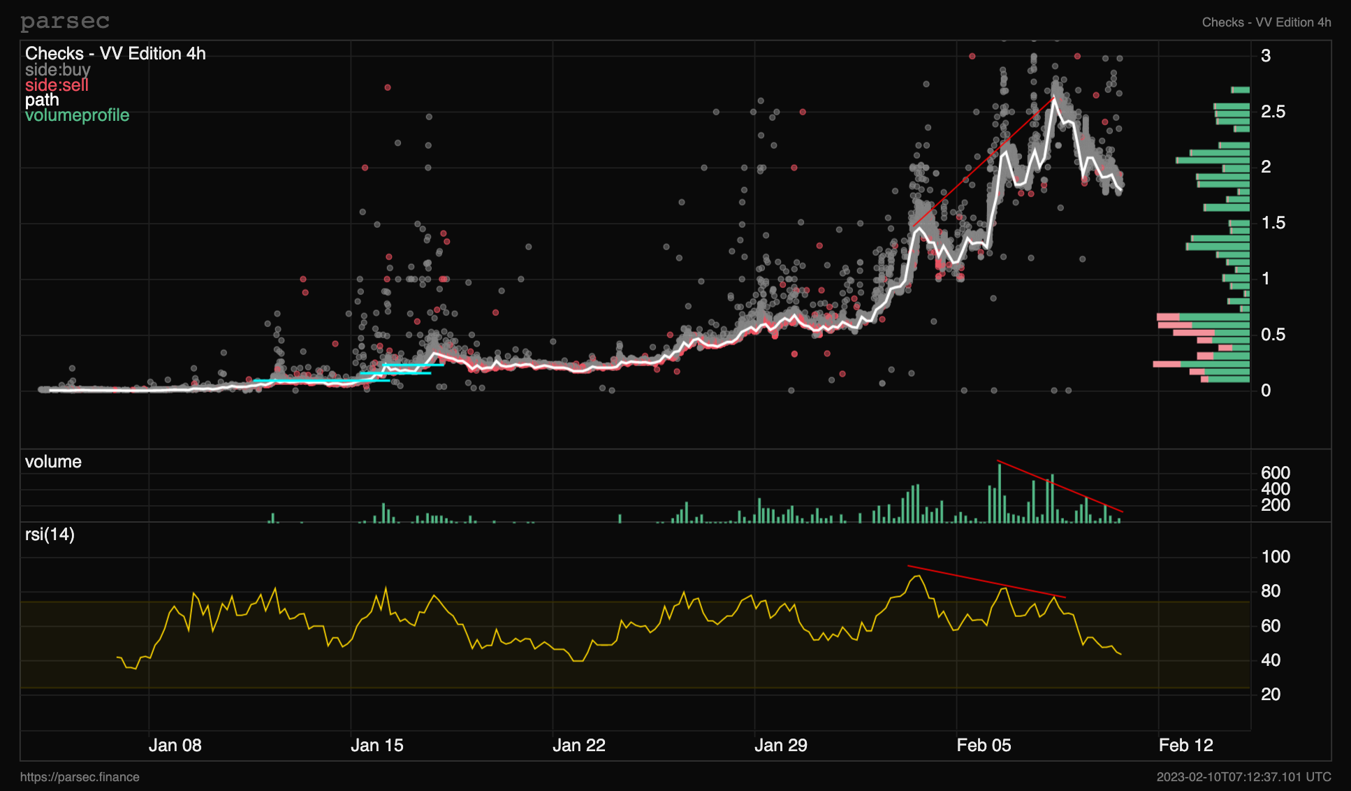Checks have been on an absolute tear since they minted in early Jan, they topped out around Ξ2.6 which is a 500x, and they currently sit at a Ξ1.7 floor. Who knows how high it will go, it’s a well thought out ponzi that’s captured the attention of the entire space and sparked an entirely new OE > burn meta. The cope and chase is always strong when something of this gravity hits, it reminds me of the euphoria and cope that was present when goblintown ran from a free mint to 9e, and I wouldn’t be surprised to see the same happen to checks as the burns begin. Though, the writing was on the wall when it came to this latest retrace, a clean bear divergence and diminishing volume.