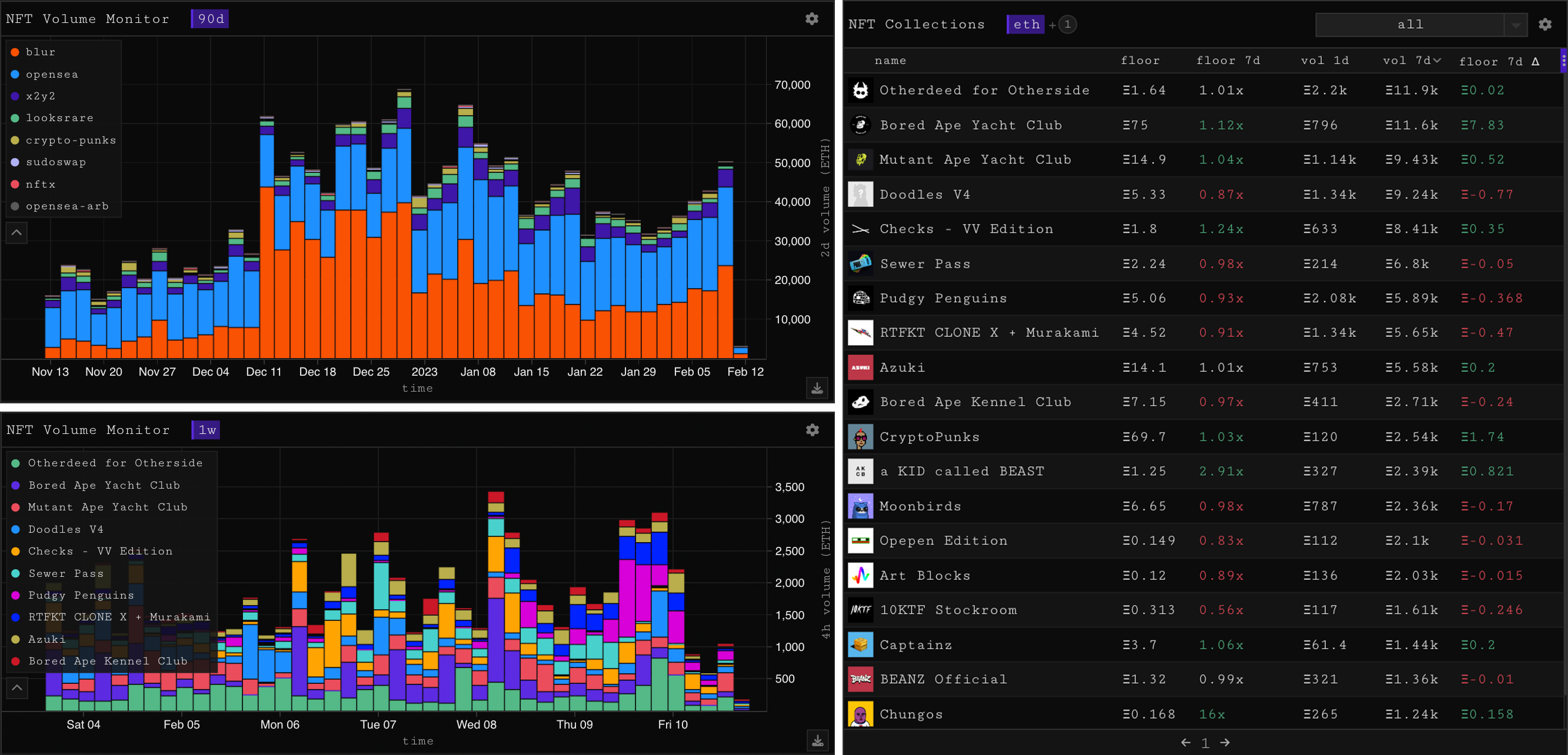 The overall market has shown great strength since the beginning of January with BTC/ETH peaking at 50% off the lows. Generally when the coins are running, NFT’s take a hit and are repriced down in USD terms. Though, this time jpegs managed to capture and hold attention on the way up, and many collections caught higher valuations as the price of ETH climbed. A phenomenon not really seen since peak bull market back in August 2021. News of the SEC cracking down on Coinbase staking has stifled the current momentum, BTC/ETH have both experienced their biggest ‘nuke’ since the beginning of the year (5%) and in turn, NFT momentum has stalled.