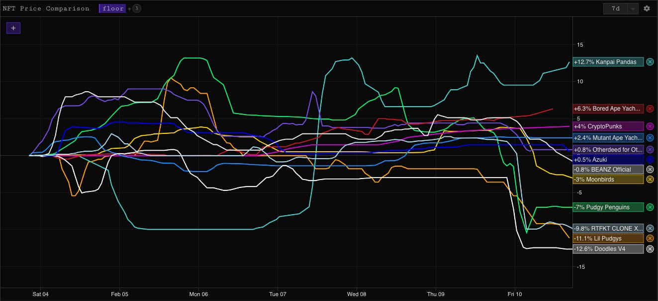 Despite volume rising, most bluechip NFT’s are down or flat in the last 7 days. Pudgy’s and Clones got murdered yesterday, both charts fell off a cliff as a flurry were sold into bids and are down around 10% in the last 24h. A Kid Called Beast is this weeks clear winner with almost a 3x on the week, and the Kanpai Pandas continue to rally off the back of their partnership announcement with UFC fighter Jon Jones.