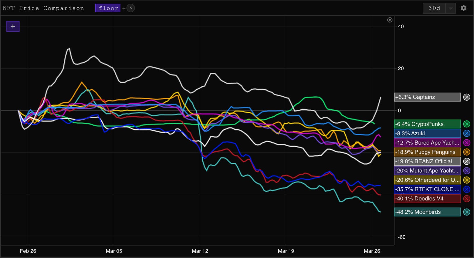 Moonbirds, Doodles and Clones continue to fall farther off their shelf and in the last 30 days, the only top collection to hold a positive floor price is Memeland’s the Captainz. It’s not pretty out there for NFT’s at the moment, it feels like they are playing out the end of the 2018 alt cycle whilst fighting against the current of BTC’s strength.