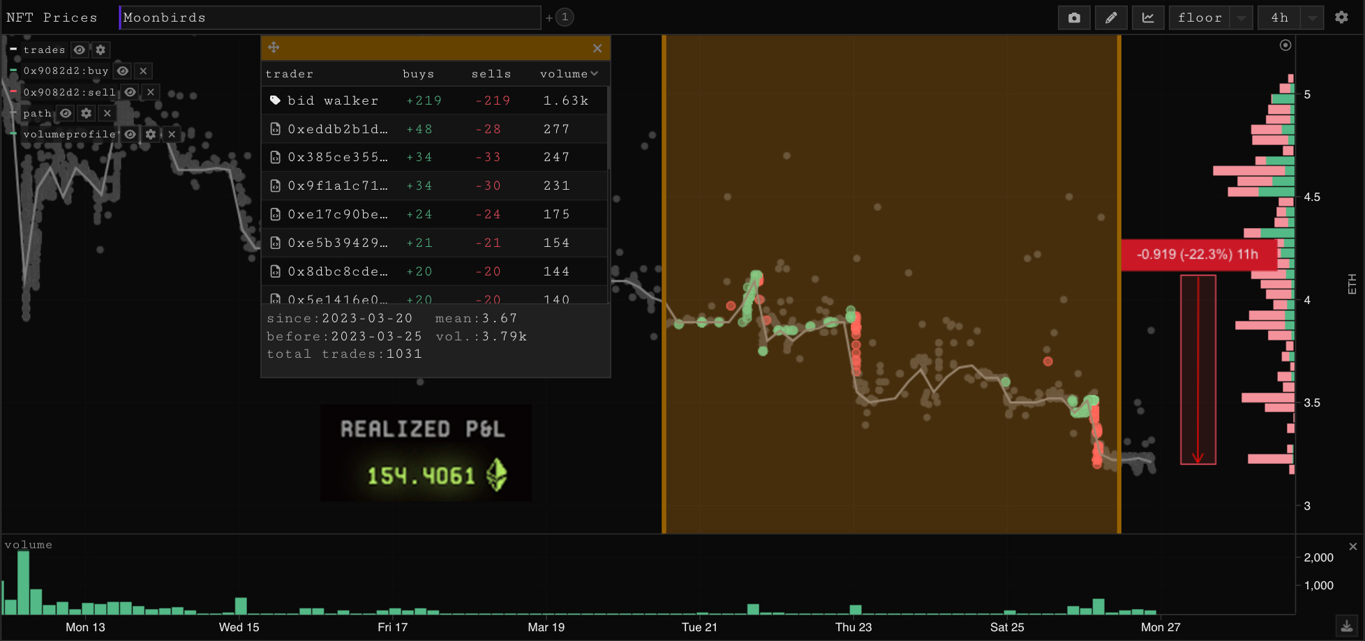 On the chart below you can see the sales of address 9082d2 who I’ve aptly named bid walker, I’d say they are most of the reason for the further 22% drawdown on Moonbirds over the last 5 days. Though the birds are not the only collection they’ve been trading, Clones, Doodles, Pudgy’s, Cool Cats and Kennels have all been tossed through the washing machine and suffered a similar fate.