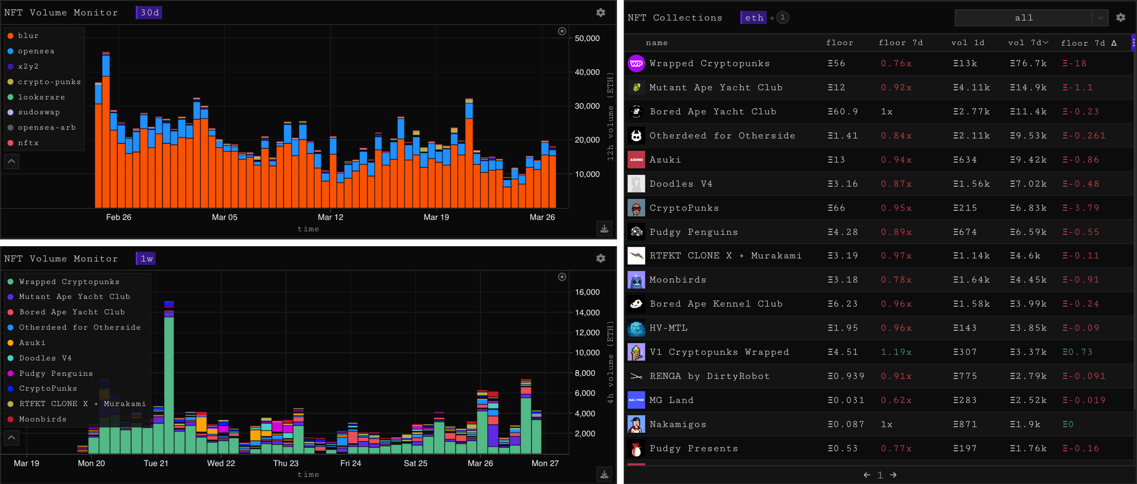 A mostly red week across the board as NFT’s continued their downtrend. Despite the crypto price action of late, multiple airdrops/supposed liquidity injections, it feels like peak bear sentiment for jpegs. Volume continues to leg down and has been mostly made up of Wrapped Punks, and blur farming shenanigans.