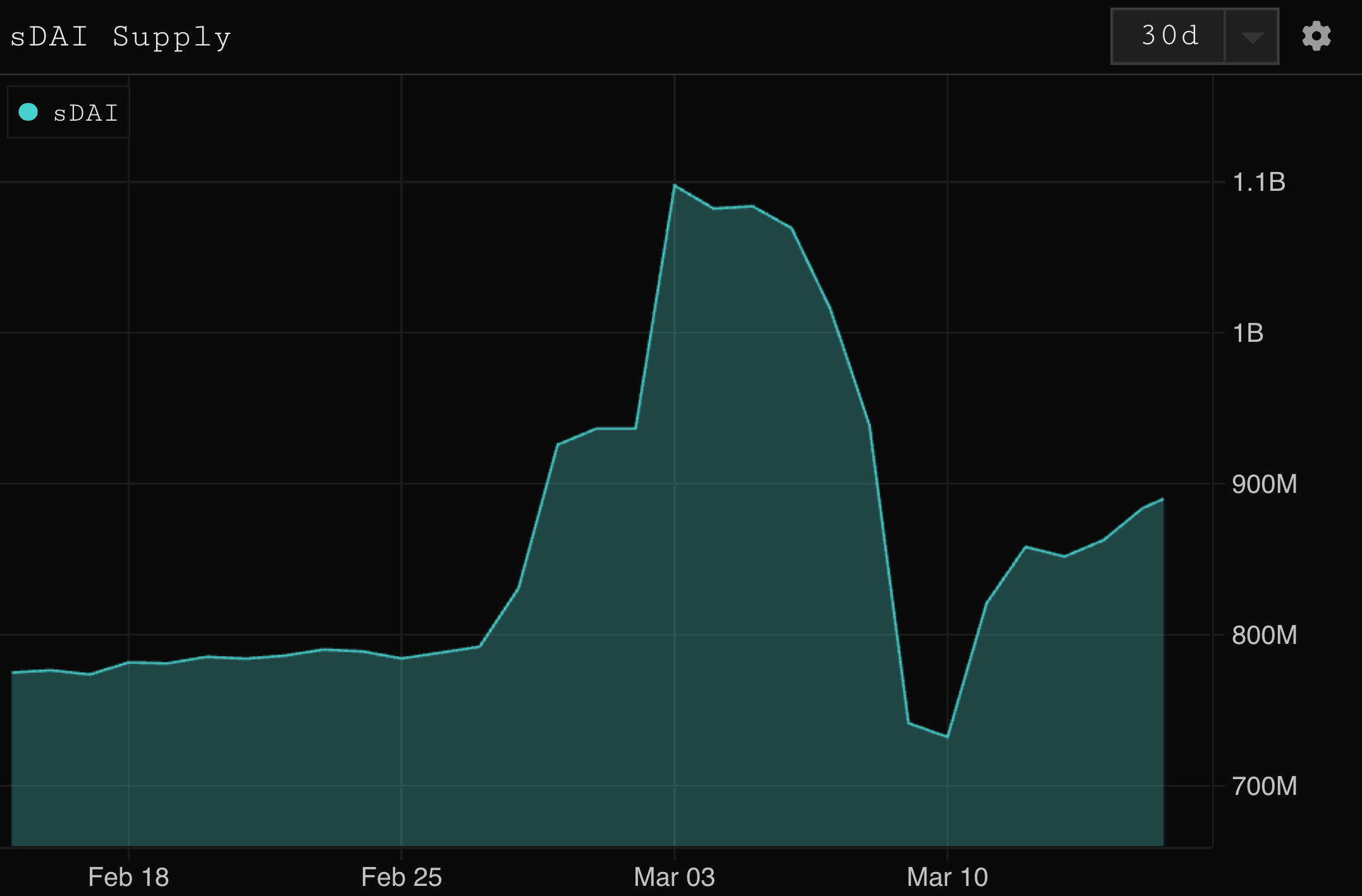 Meanwhile, DAI supply has been down and sDAI supply has been largely flat over the same period: