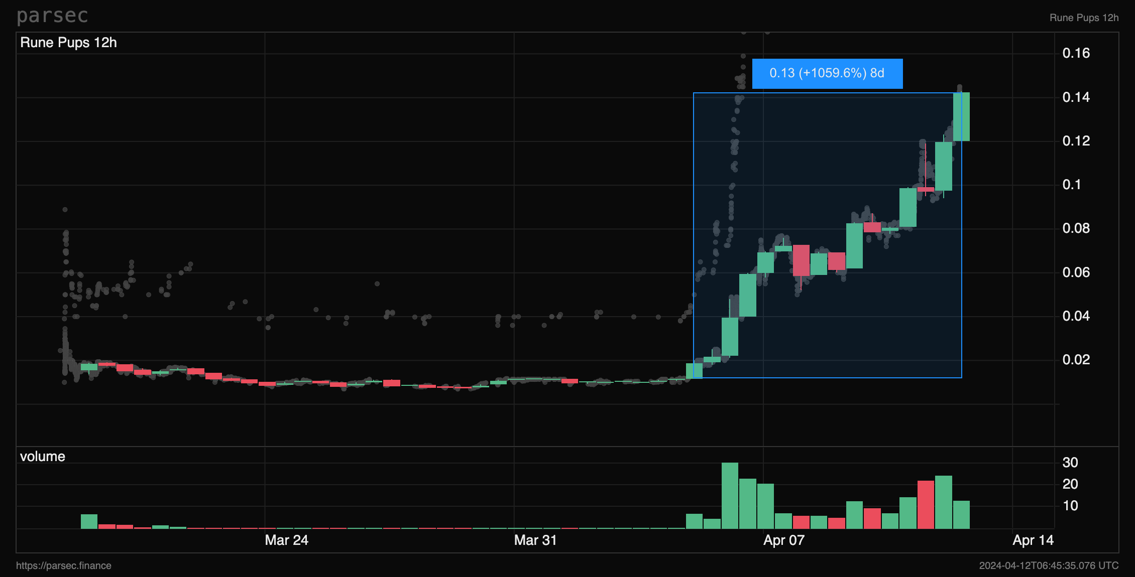 But for now it does feel a little toppy leading into the halvening. Rune pups are the current pack leader and are up 1000% in the last 8 days and sitting around a 500m market cap.
