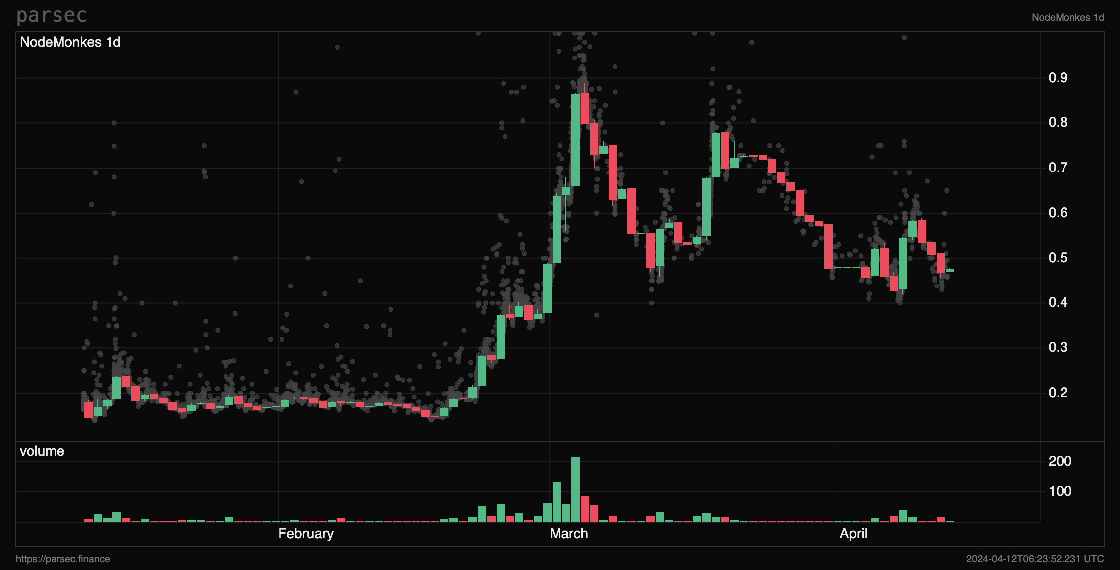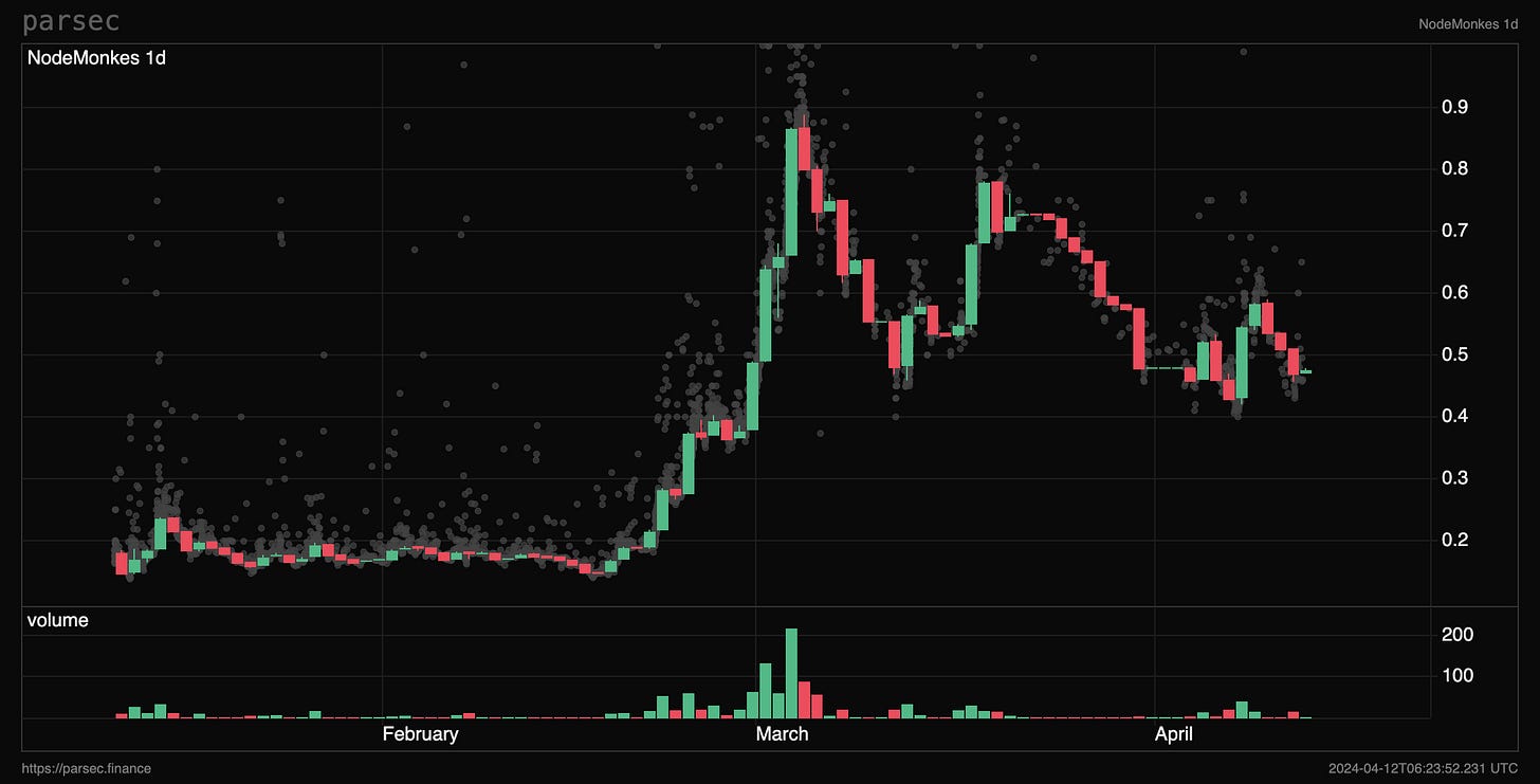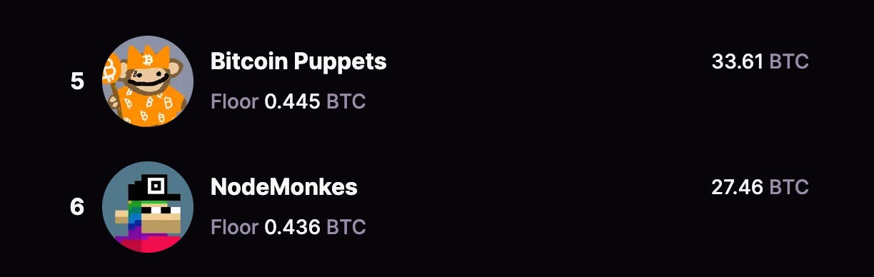 There are essentially two front runners in the Ordinals eco, Bitcoin puppets and Nodemonkes. Both had a massive run up in mid-Feb as attention flowed from a floundering Ethereum NFT eco to Bitcoin. Nodemonkes gained 500% in two weeks topping out around 0.9 BTC and Puppets a little less with a 350% run topping out around 0.27 BTC.