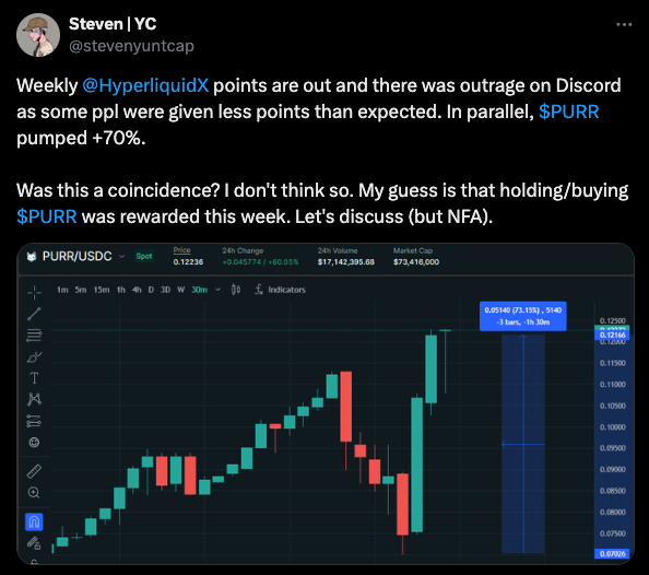 Many have been actively farming HL’s points program since the beginning. This morning was this weeks points distribution, it was heavily weighted towards spot buyers sparking some outrage from longterm farmers and as a side effect $PURR caught a bid as people figured out it was the new best way to farm HL.