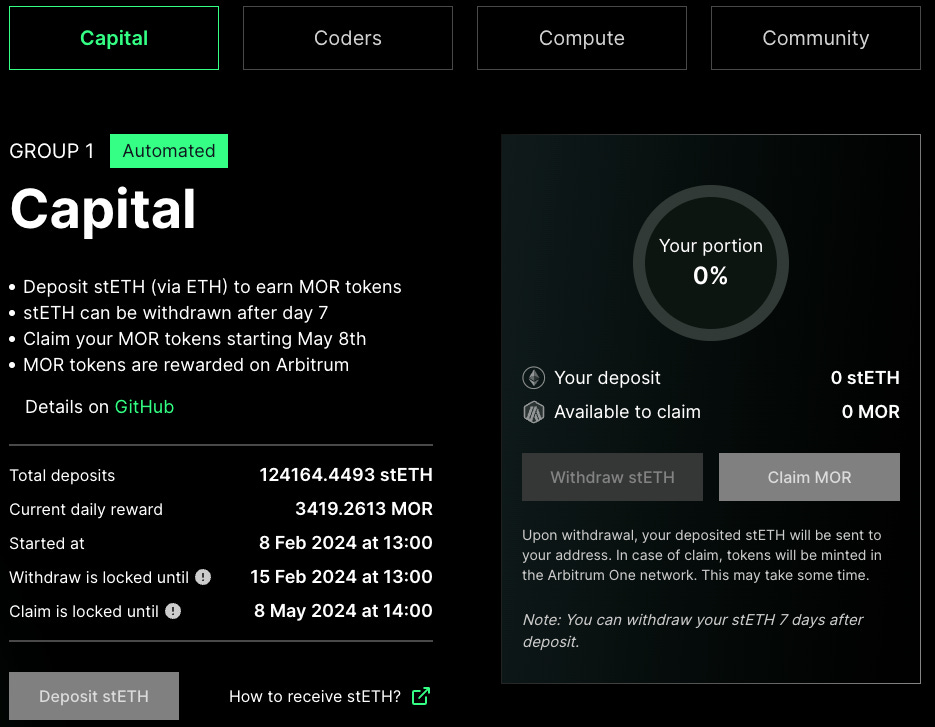 As a fair launch project, Morpheus is funding its protocol owned liquidity using the stETH yield of stETH depositors into the protocol. This farming program began on February 8th with the native token MOR emitted each day using the following distribution: 24% to the community, 24% to capital, 24% to compute, 24% to coders, and 4% for protection funds. stETH depositors will unlock their MOR emissions on May 8th which will likely be when the MOR TGE takes place via the POL LP pool launch.
