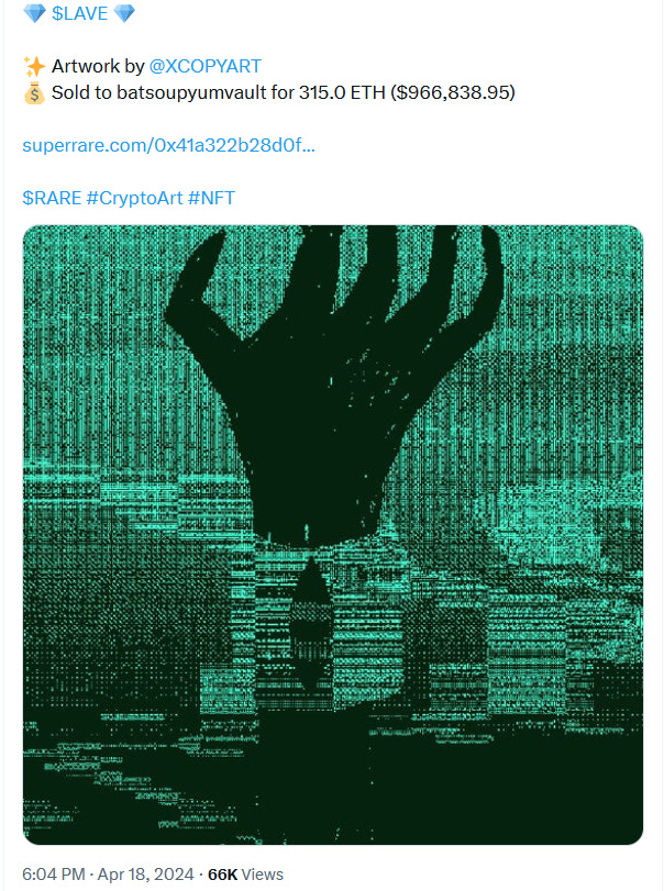 There’s been a number of high profile sales of late. Three of the highest punk sales ever happened in the last two months, with the latest being today for $12m. A number of early and low edition XCOPY’s have also sold for between 50-400e in the last few weeks.