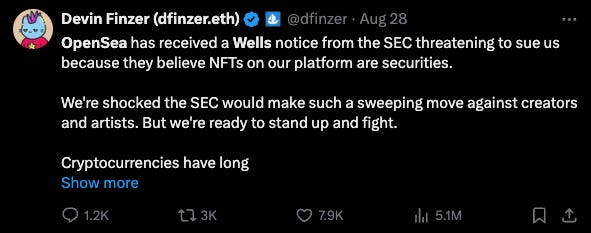 The institutions are coming for your jpegs, and not in a good way. The SEC has issued a Wells notice to Opensea, implying they think that the platform is illegally aiding in the distribution of securities. While I don’t disagree that some NFT’s probably have securities-esque promises (NFT’s is a very broad term), it feels a little bit like Gary is taking one last stab in the dark after a series of sunk tax payer funds and lost cases for the SEC over the last 12 months.