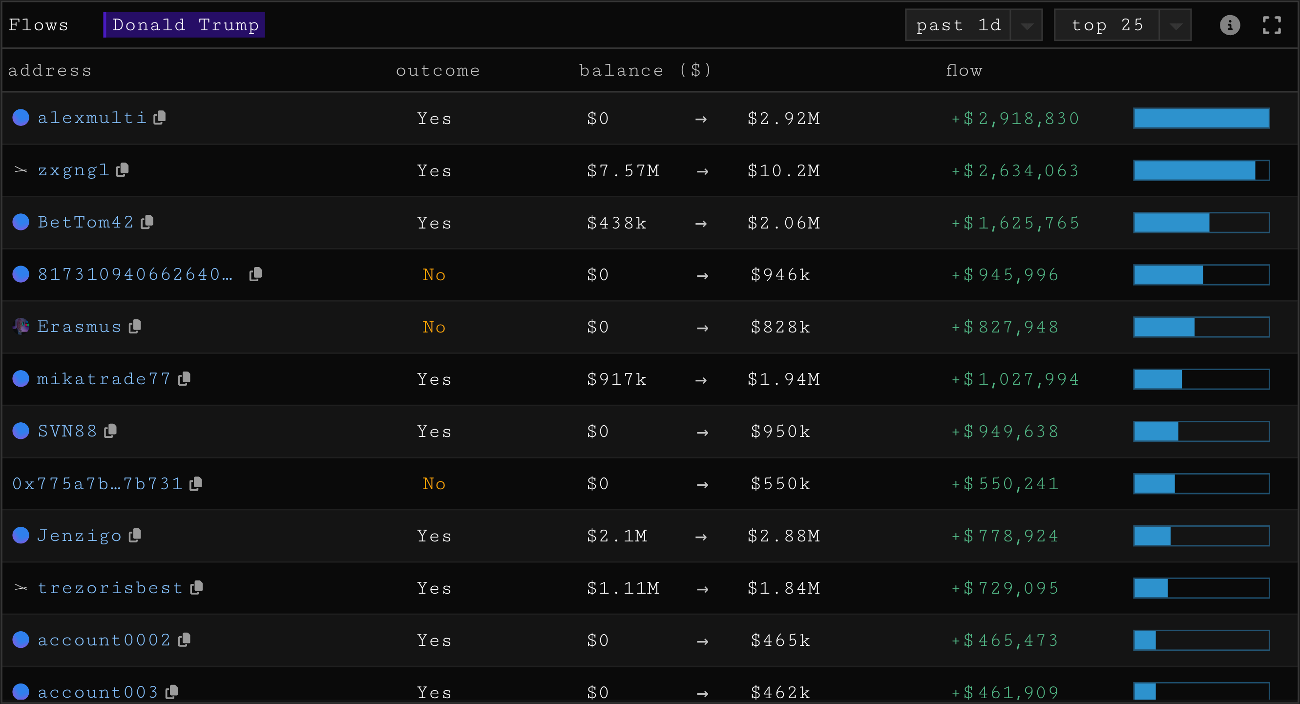 By default, it shows the top 25 flows in USD within your chosen timeframe (1h - 7d). In the last 24hrs, there have been some big accumulators of Trump YES with top holder zxgng1 doubling down and adding almost $3m, taking their holdings from $7.7m → $10.3m! As well as a fresh wallet also accumulating nearly $3m.