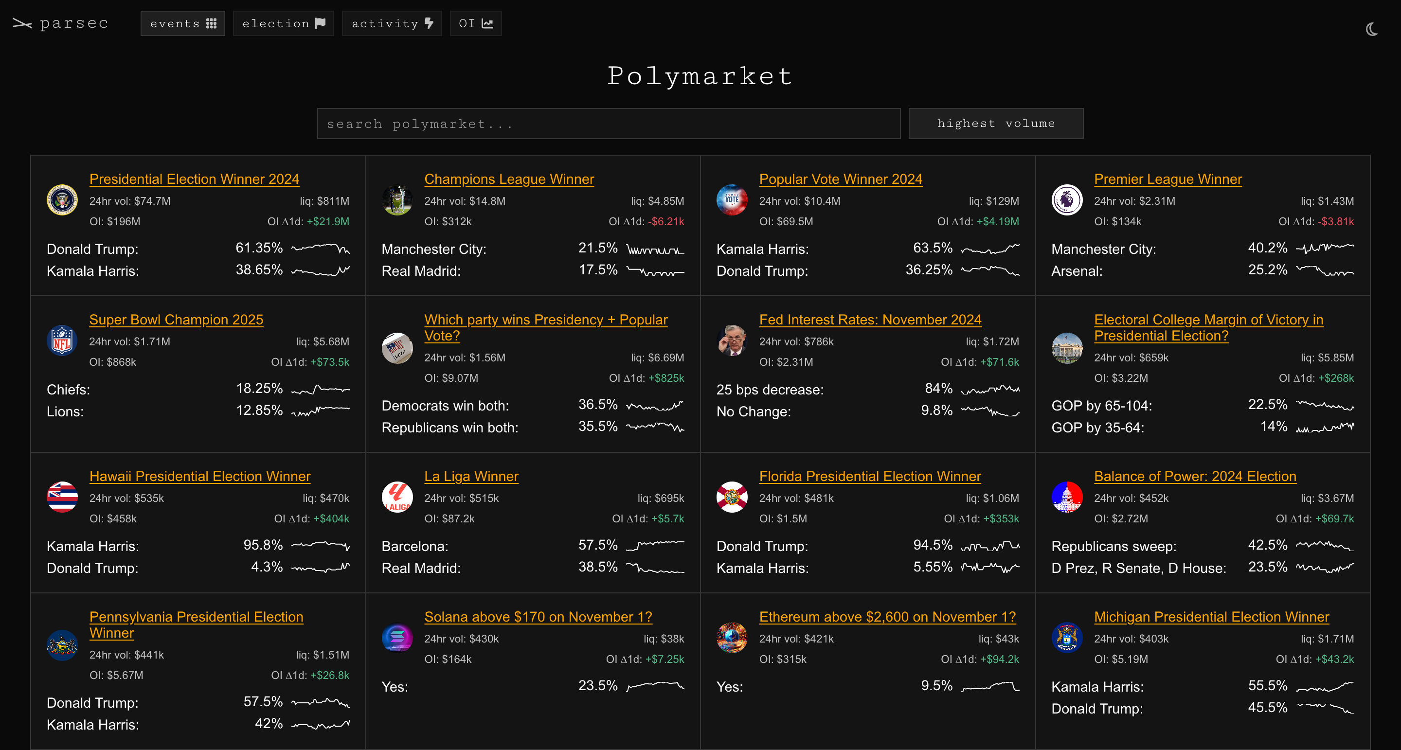 We couldn’t be more excited to formally announce the arrival of Polymarket Analytics on Parsec. Getting started is as easy as searching for your favourite market on our homepage or clicking through to parsec.fi/polymarket and exploring.