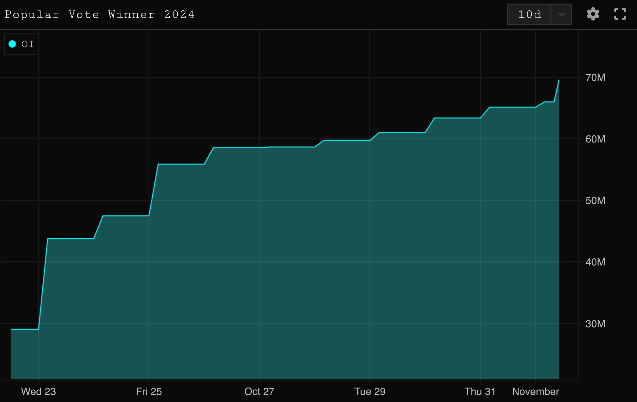 While the main event is the Presidential election market, the open interest for the Popular vote market is rapidly growing at over twice the speed, it’s up 600% from $10m to $70m in the last two weeks: