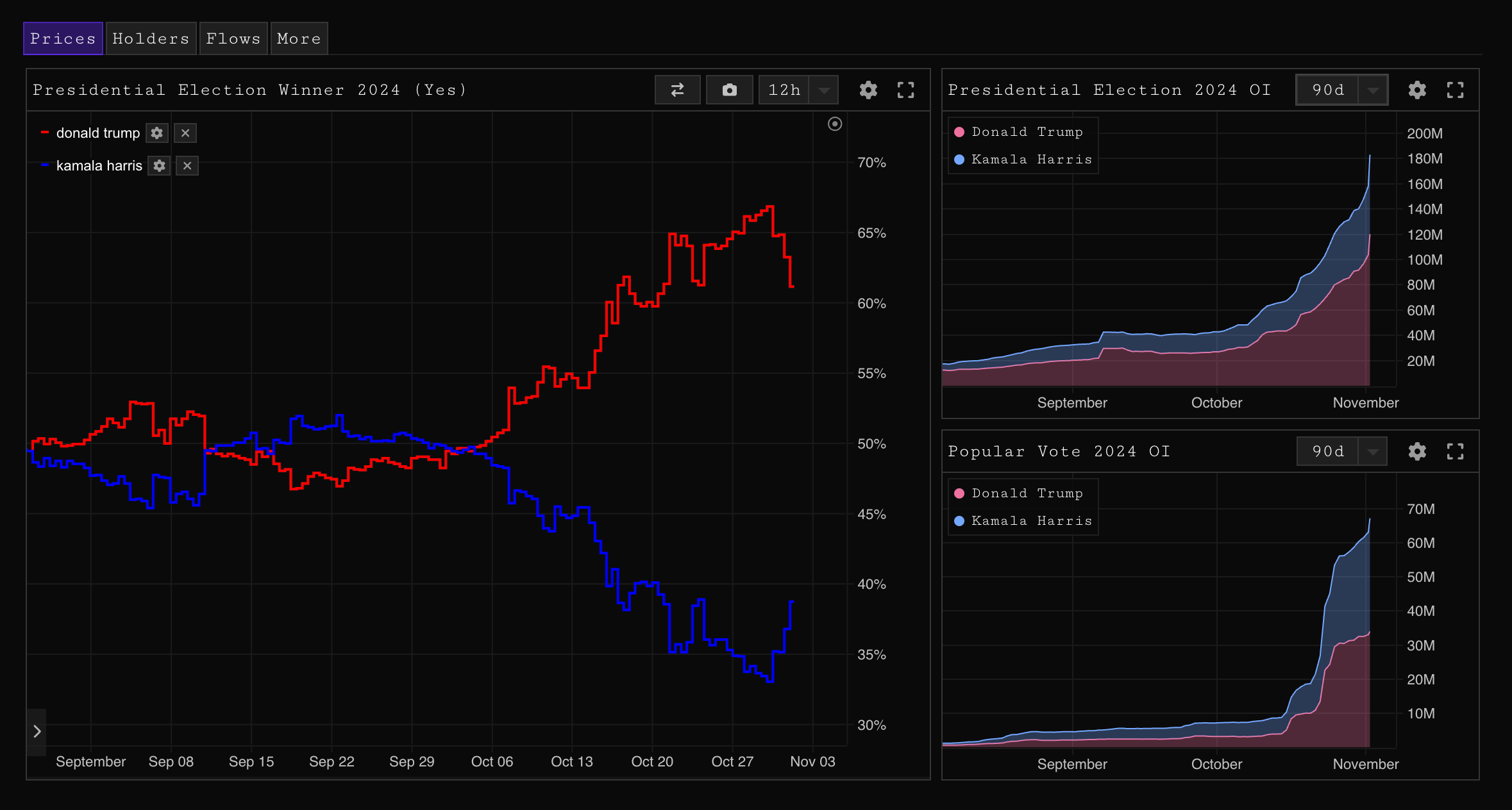 We are now just T-minus four days out from the big day and the odds are starting to converge with the polls. Crypto bros have been shovelling money into Trump YES shares since early October, open interest is up a 4x from $45m to $180m in that time. Other odds providers and the polls haven’t been following suit and it looks like we are finally seeing some rational derisking. Trump YES is down 6% in the last day or so.