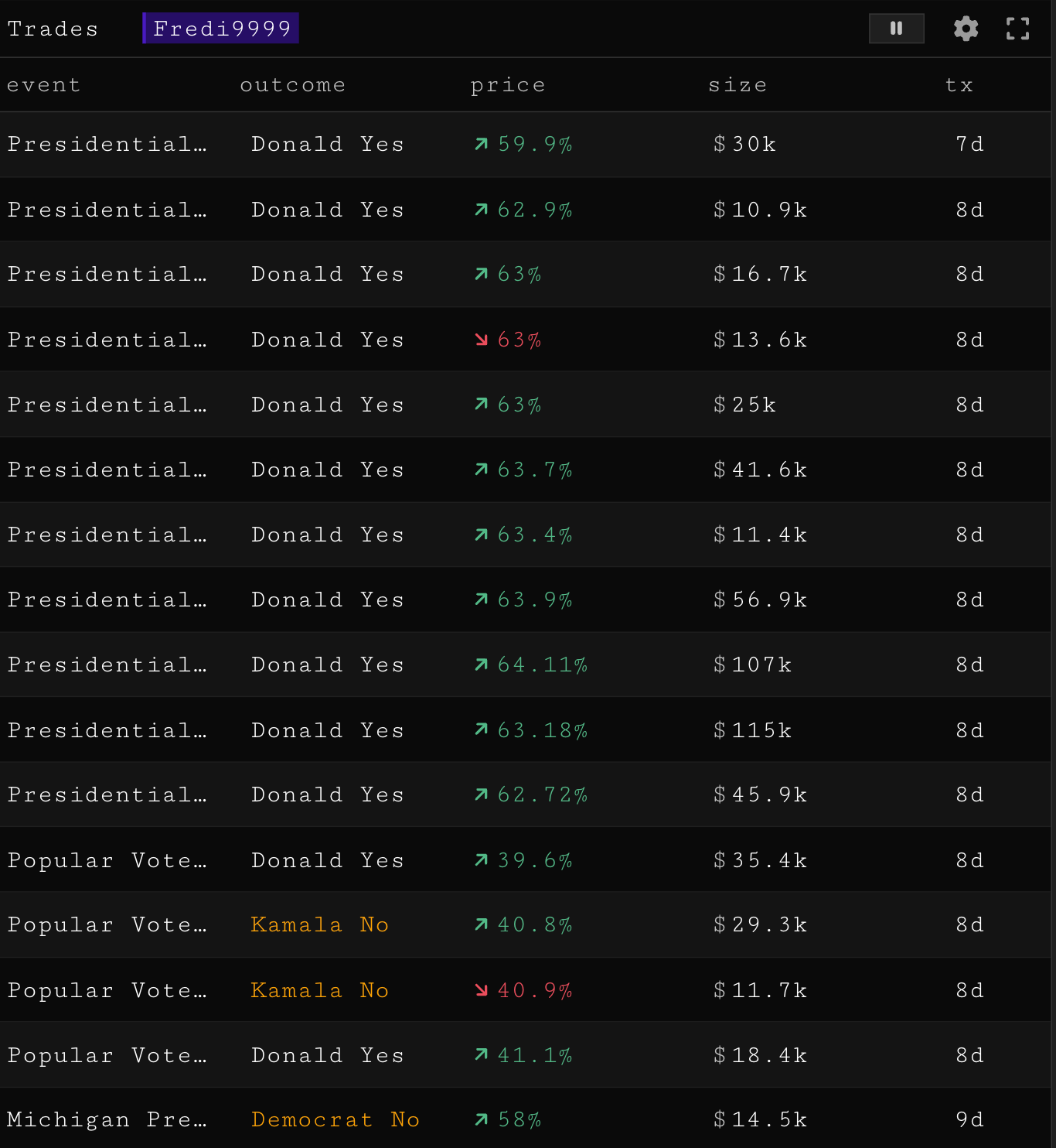 Using these filters, here we see large trades from the top holder of Trump YES: