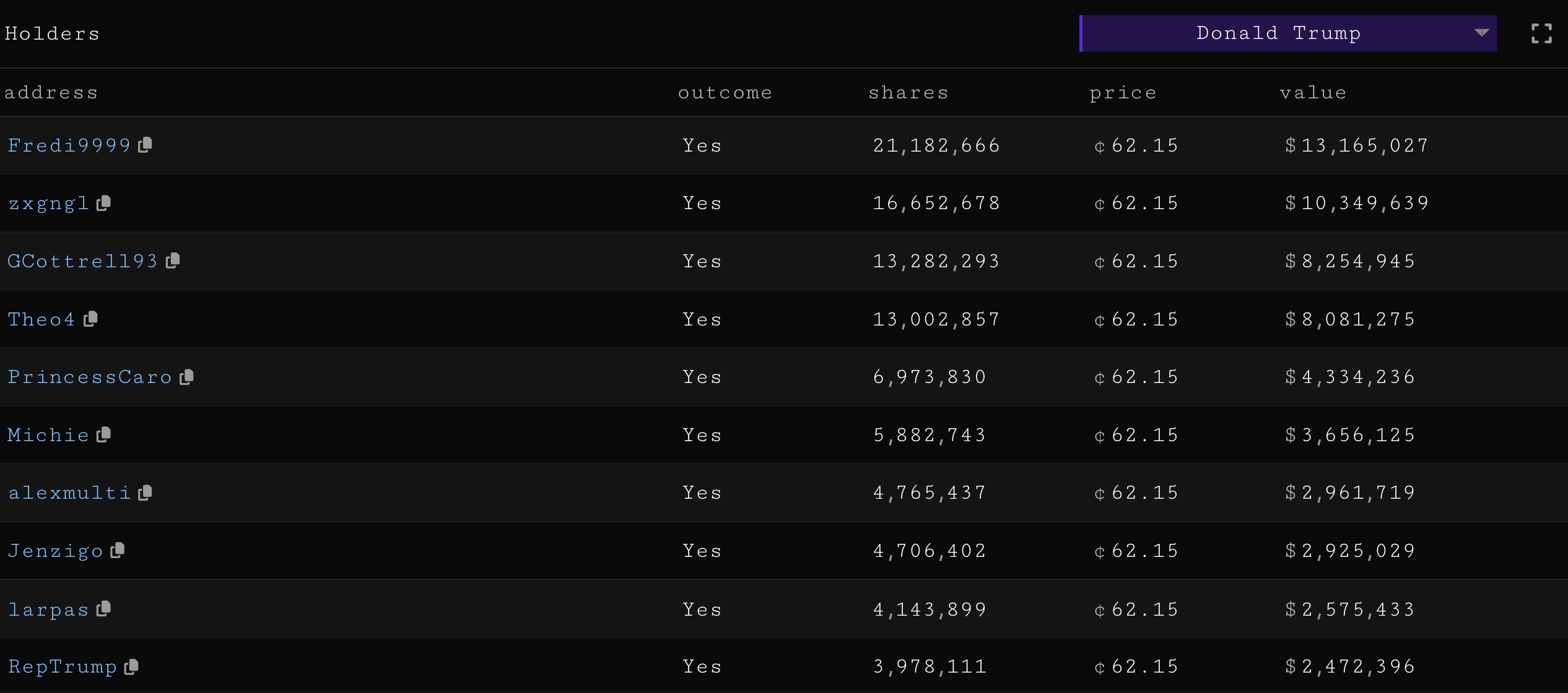 Interestingly, for the election market we’ve seen a significant divergence between top Trump and Kamala holders - the top Trump YES holder has $13m while the top Kamala YES holder owns just $2m.