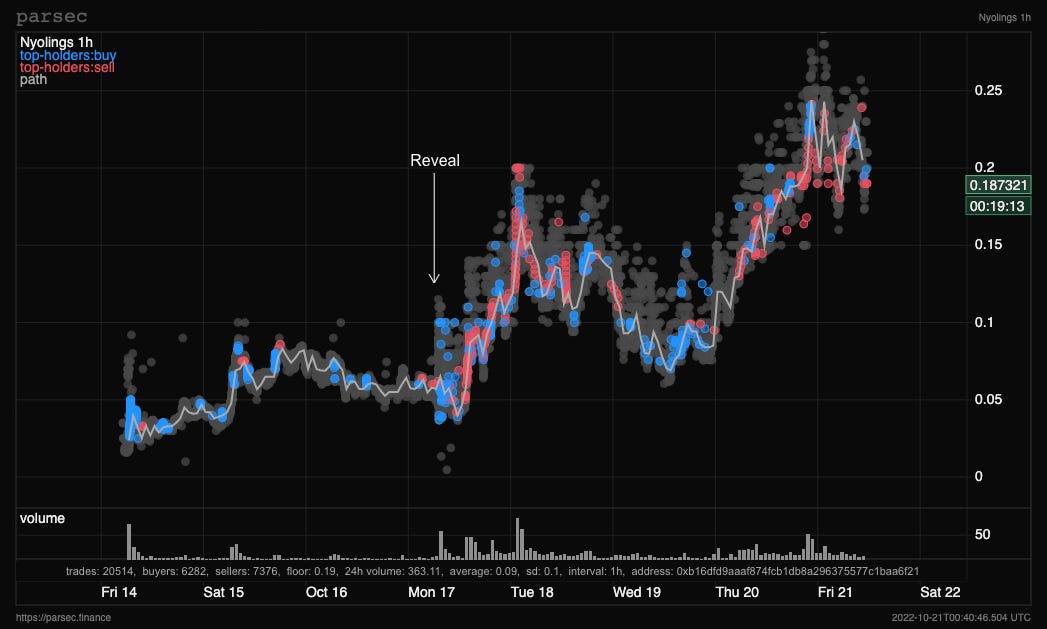 Nyolings - are this weeks bear market success story. Sneak peeks and marketing of the cute, claymation pfp’s originally began back in April so they’ve managed to foster a decent sized community and following. They minted out just over a week ago to a combination of an allowlist and a public dutch auction. Starting at 0.03 ETH (bear market tings), it made its way down to 0.01 before finding enough buy pressure to sell out.