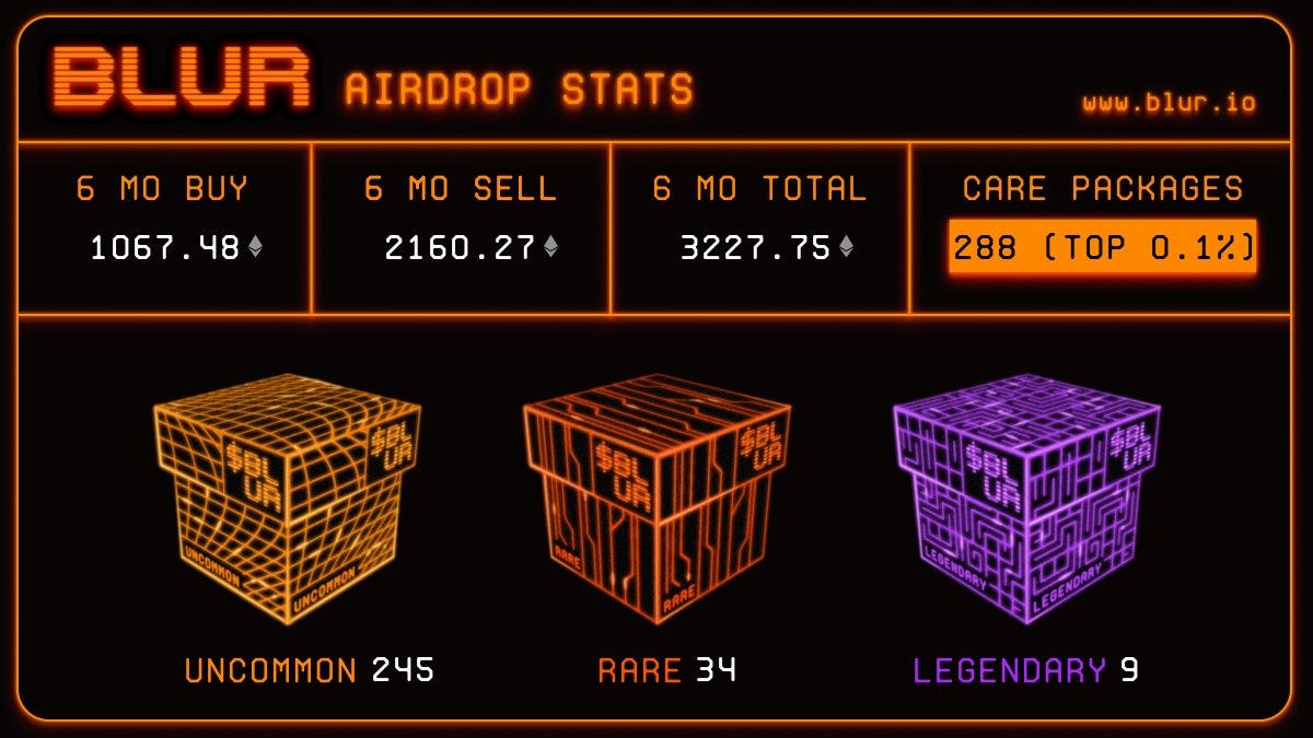 Along with the launch the team confirmed a two-part airdrop, with the token going live 3 months from now in January 2023 (feel old yet?). The criteria for wave 1 is total volume across all marketplaces in the last 6 months. For now, receivers get care packages that range from uncommon to legendary in rarity, the more rare yielding more tokens come actual drop time.