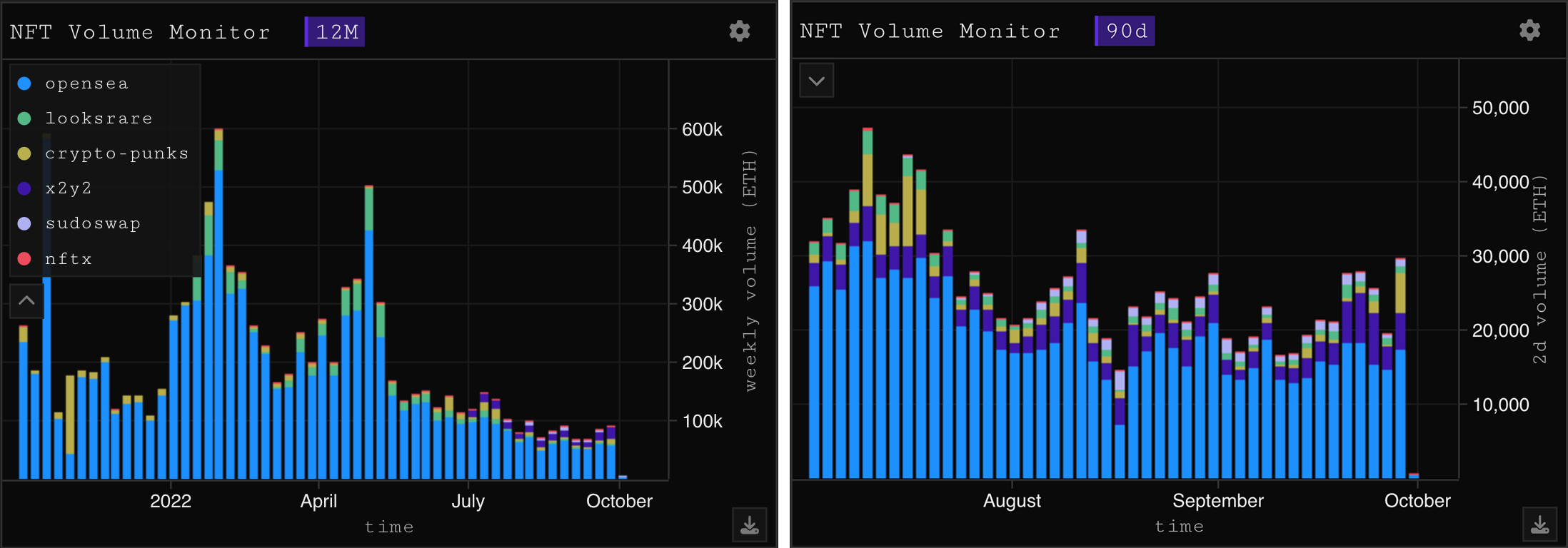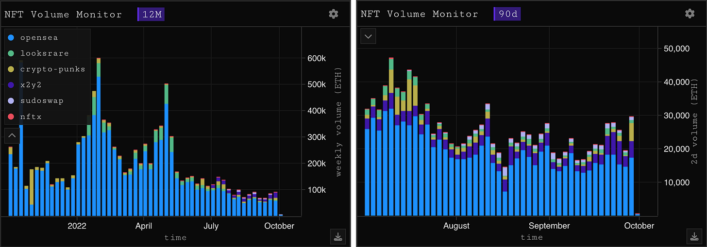 Some very large trades happened this week but not so many new projects or renewed interest in older ones. The famed hoodie ape punk sold for 3.3k ETH ($4.4m), an M3 mega mutant for 1k ETH ($1.3m) and a trippy fur ape was swapped for 3 floor apes, 3 kodas and a BAYC tier otherdeed. Don’t be fooled though sweet child, this type of stuff is exciting and impressive and may briefly take our mind off our bear market sorrows, but we’re not out of the woods until we see comparable and consistent volume return to NFT’s and these HTF volume charts look a whole lot better.