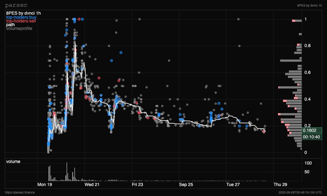 The collection that kicked all of this off was 8pes which minted for 0.008 and ran all the way to 0.9 ETH at the top. Low supply causes high volatility and incredibly fast run ups as well as dumps. You can see the vertical fomo sweeps before any more could be listed.