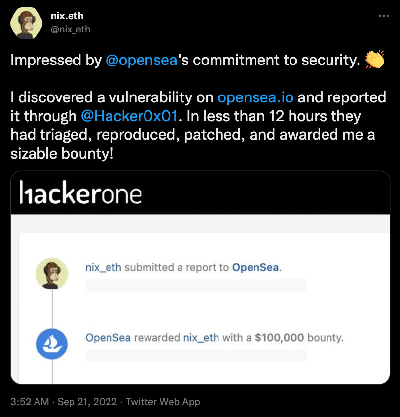 But OS has recently upped their security game and entered into partnership with HackerOne to provide up to market standard bug bounties for exploits ranging from low risk to critical. Two whitehat hackers, Corben and nix.eth have recently been awarded $100,000 each for reporting critical bugs. $100k may seem like a lot if you you are not familiar with bug bounties but it’s not. A number of crypto protocols offer huge multiples of that amount to protect against potential large scale hacks. The difference is the volume of stolen funds possible between an NFT related hack and a token treasury hack. Many of these large DeFi protocols manage hundreds of millions of dollars and up to billions, if they are to go down it’s likely that whole sectors of the treasury can get drained. Whereas an NFT hack is generally picking off funds user by user like the ‘old listing’ exploit.
